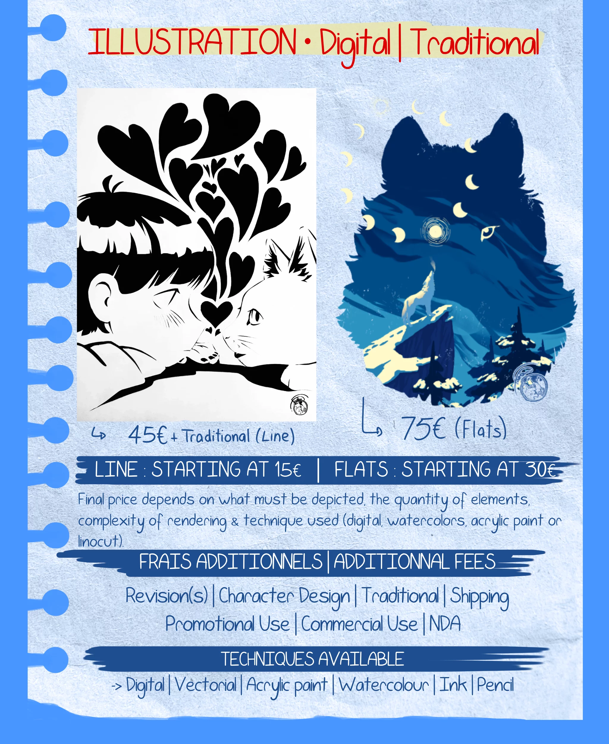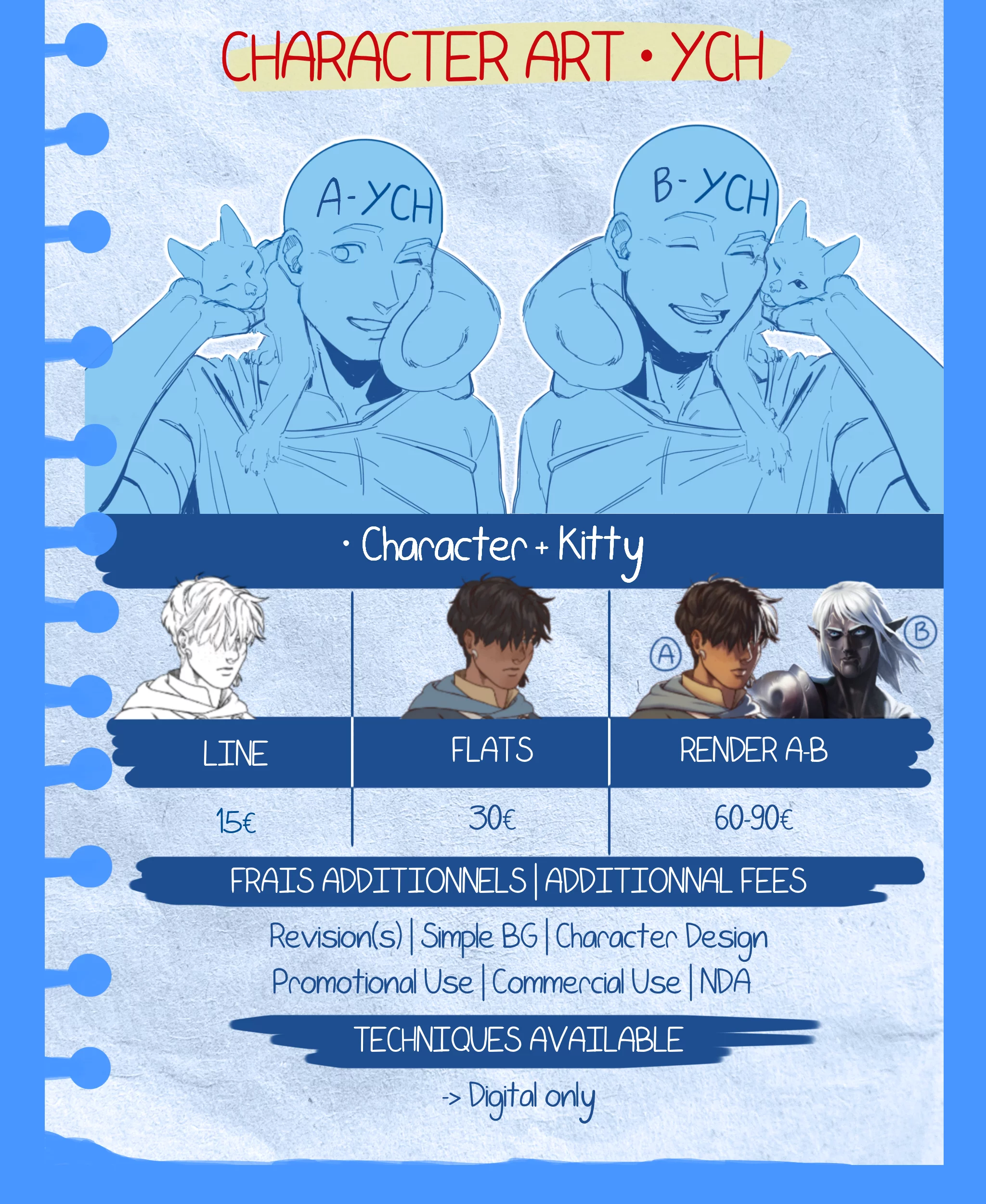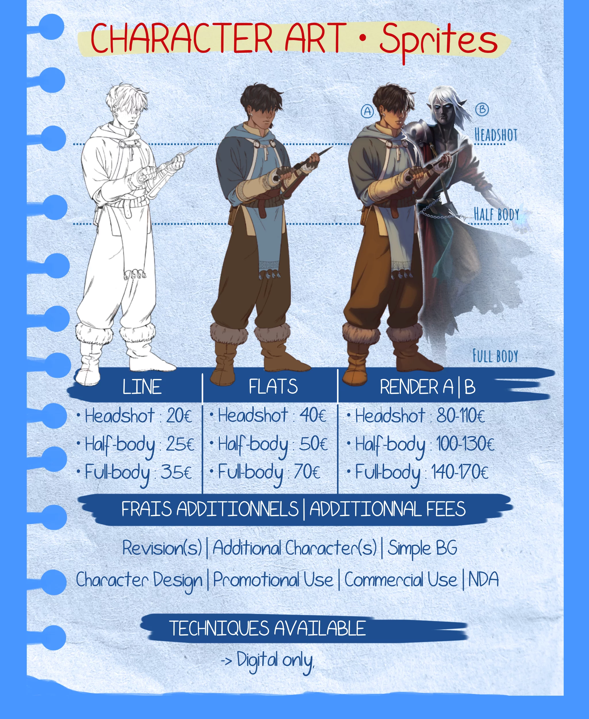 Frais applicables : Révision ; Character Design ; Traditionnel ; Livraison ; Usage Promotionnel ; Usage Commercial ; NDA