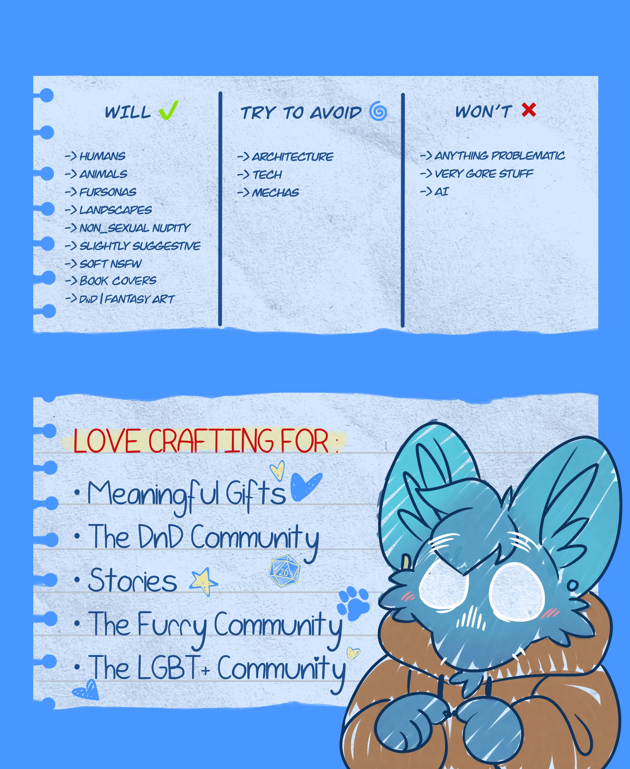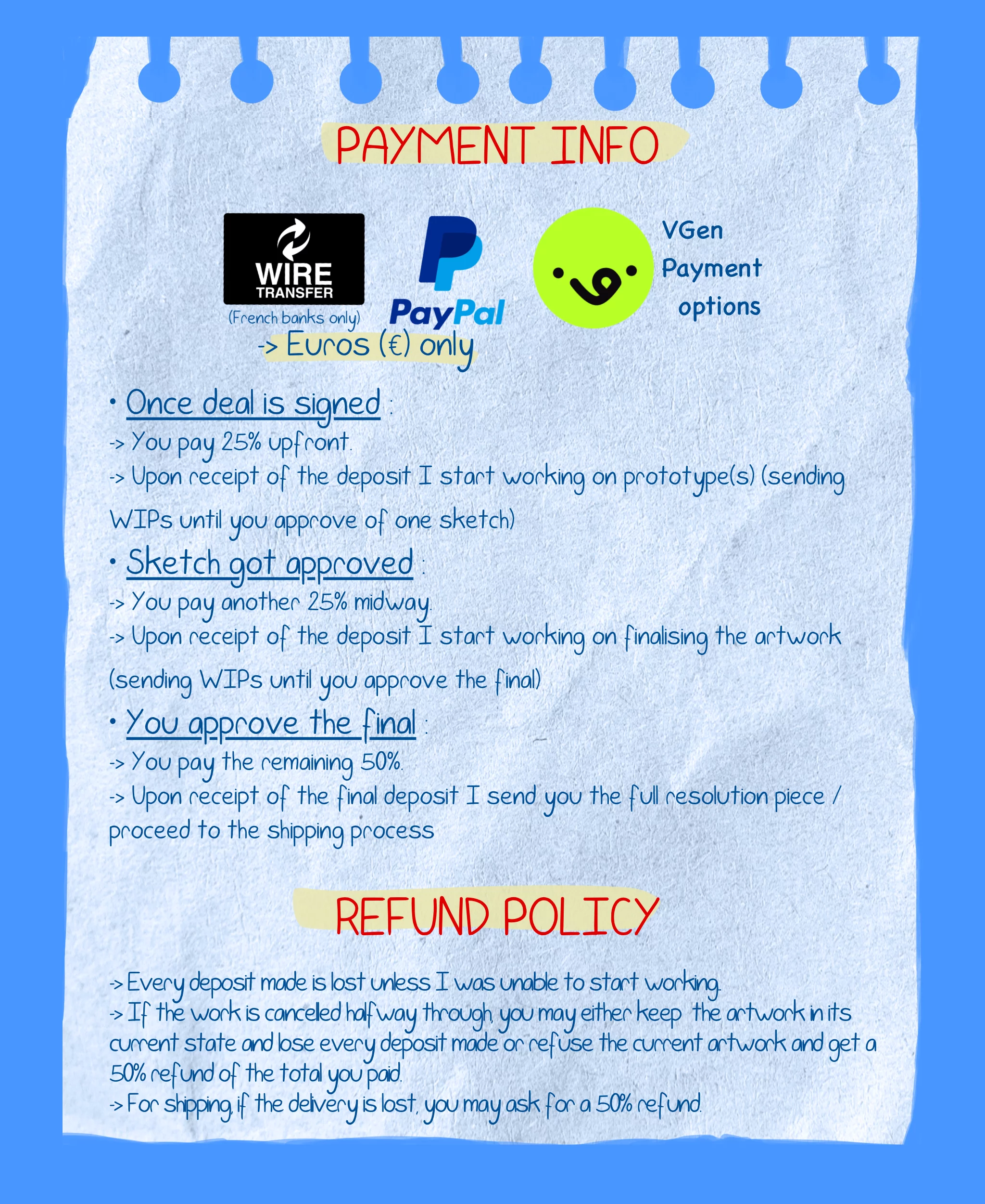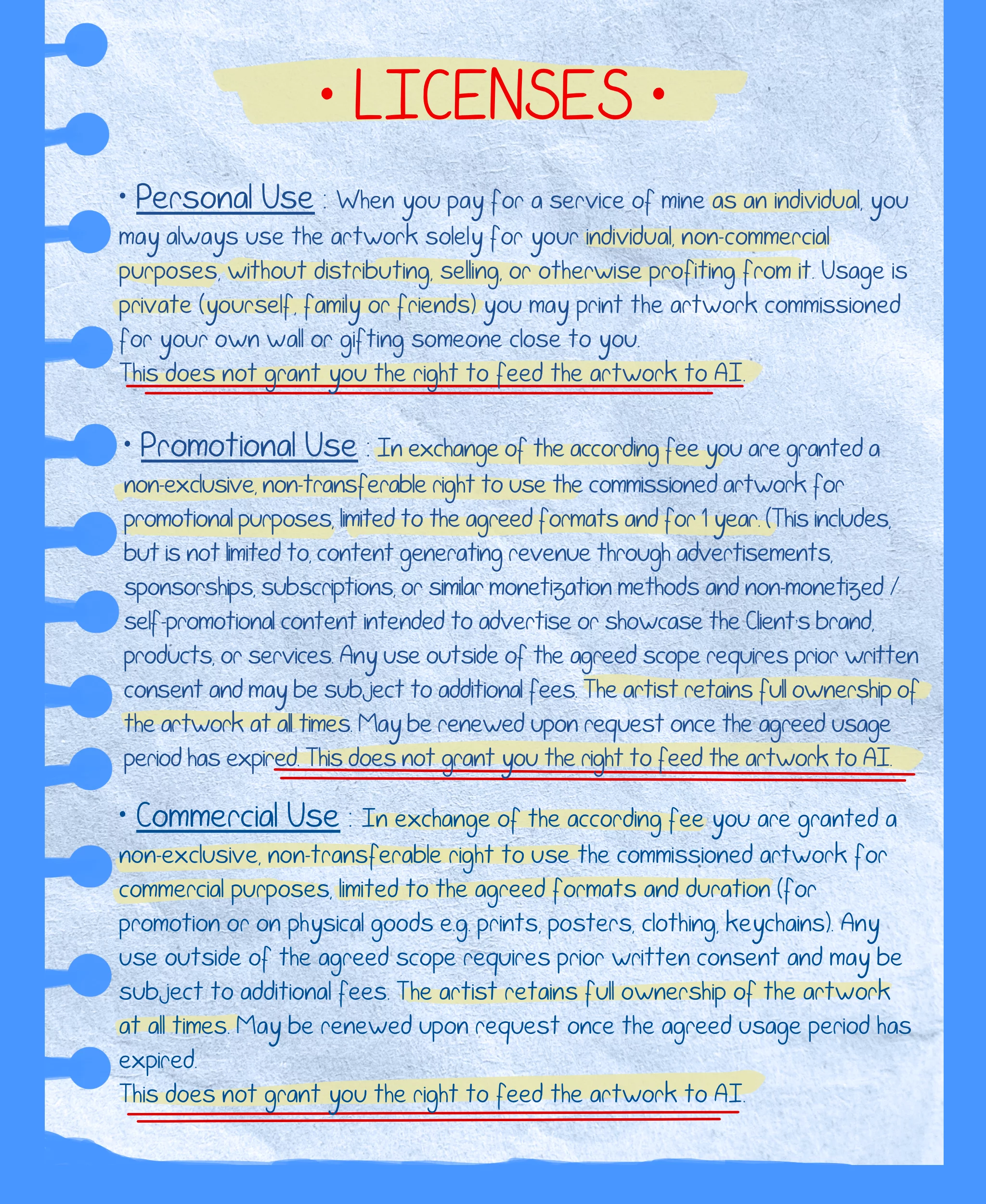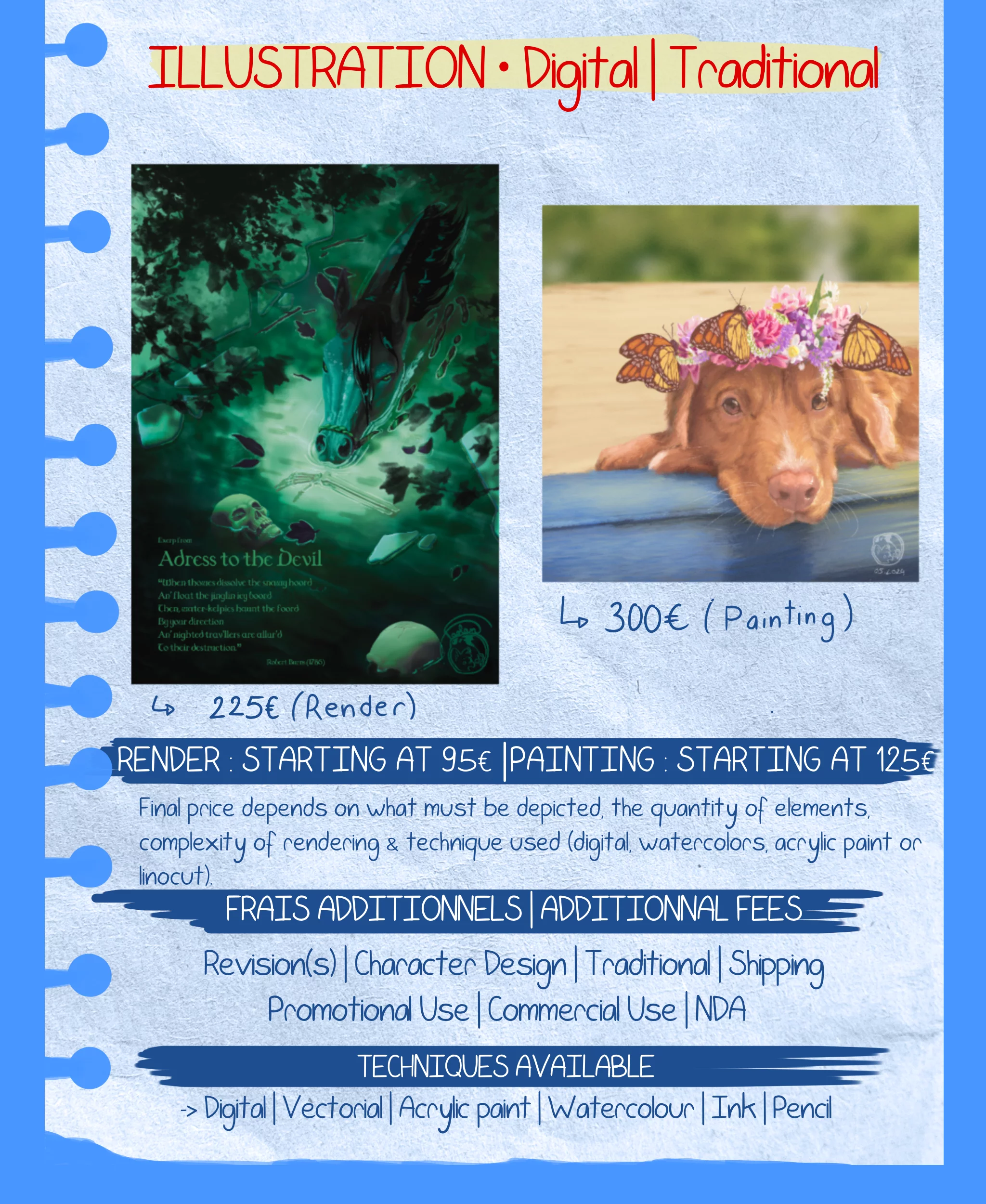 Frais applicables : Révision ; Character Design ; Traditionnel ; Livraison ; Usage Promotionnel ; Usage Commercial ; NDA