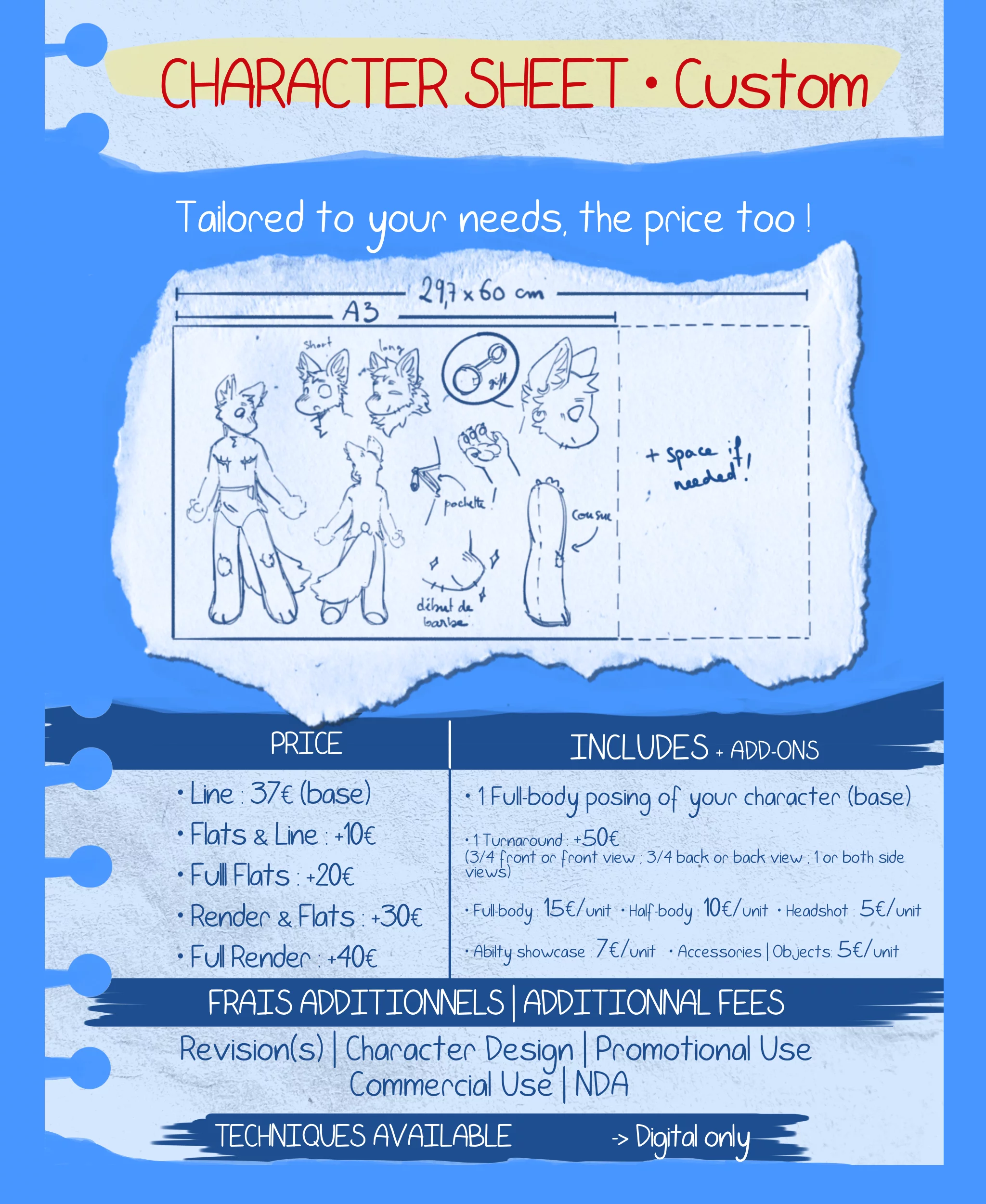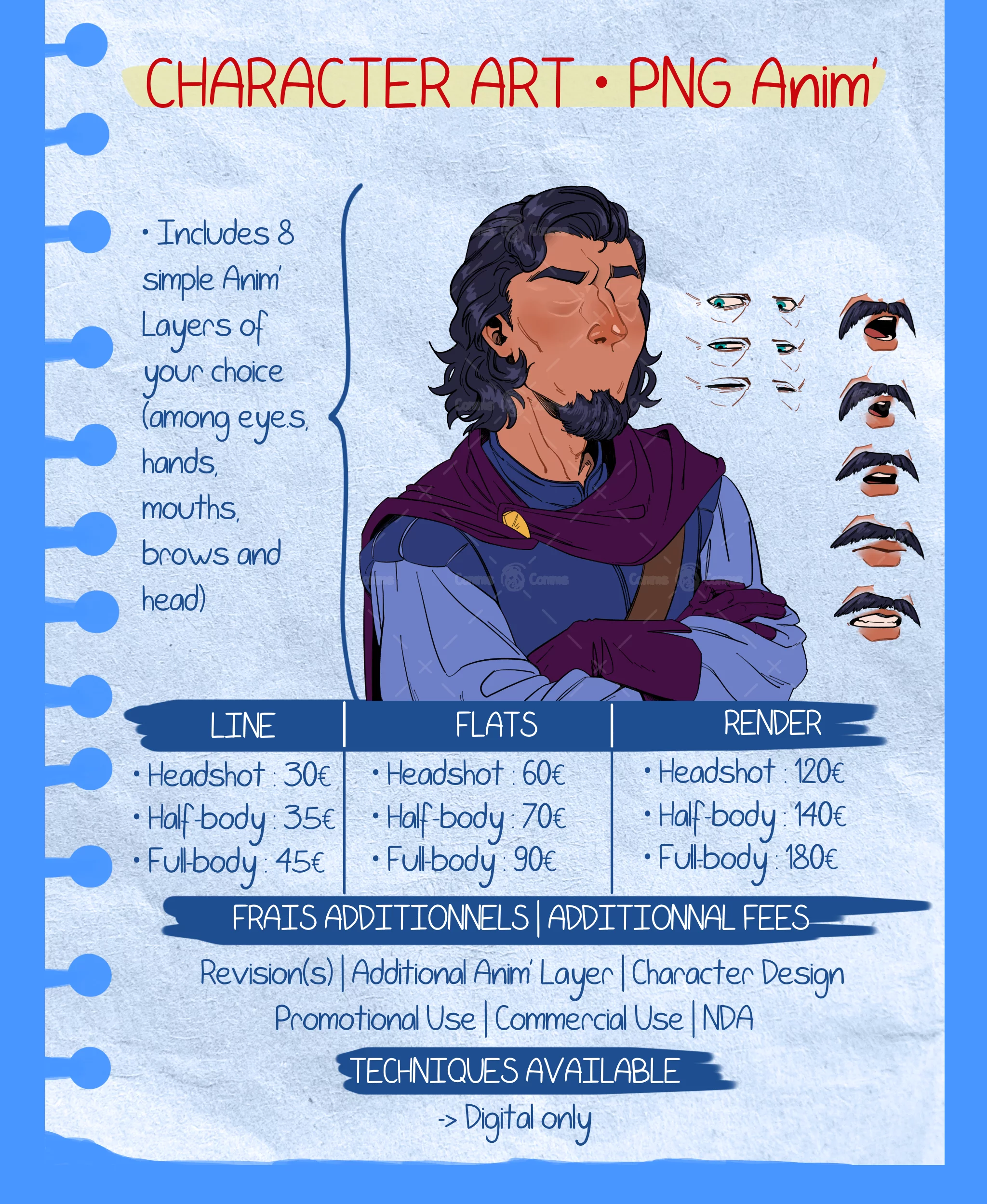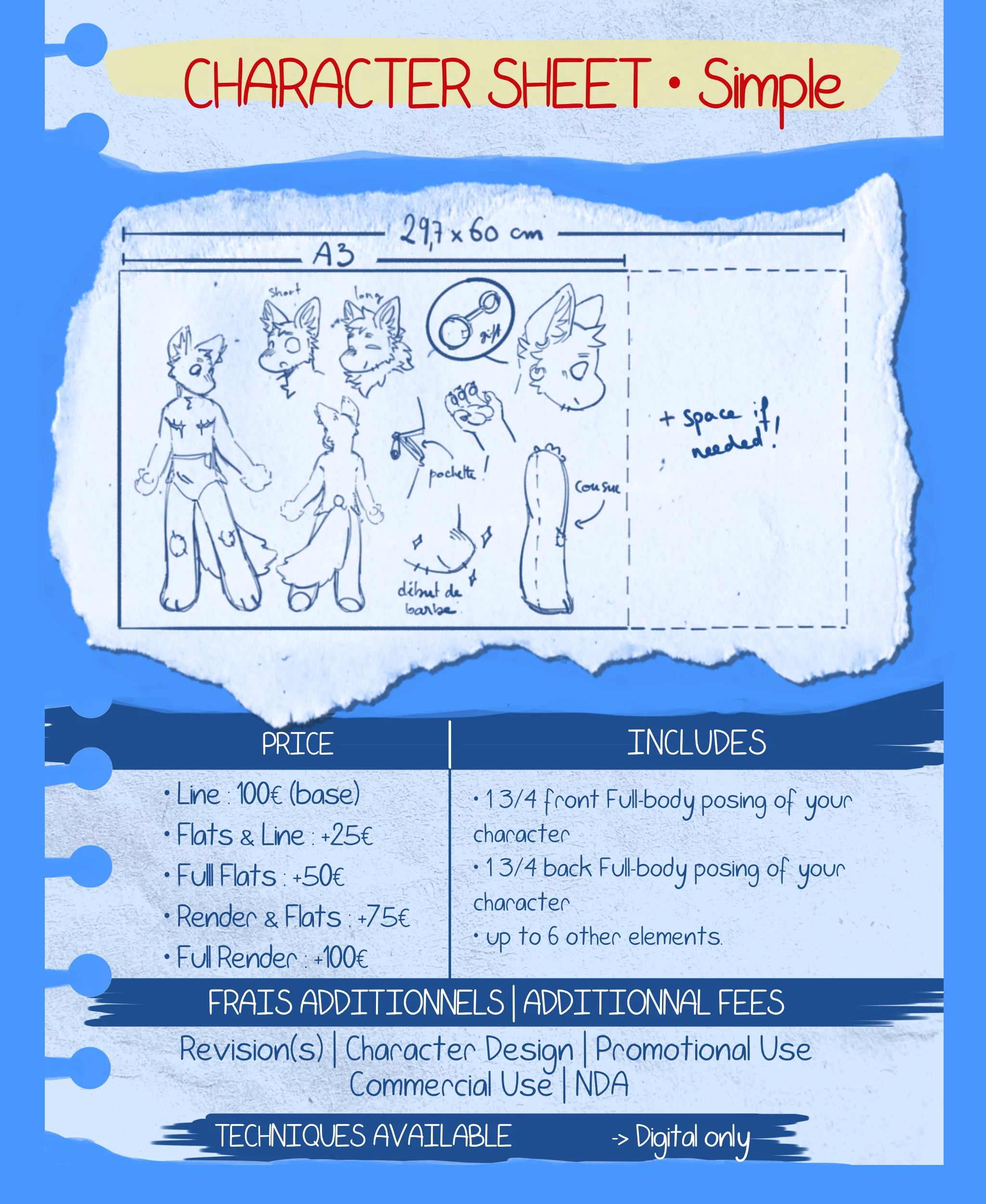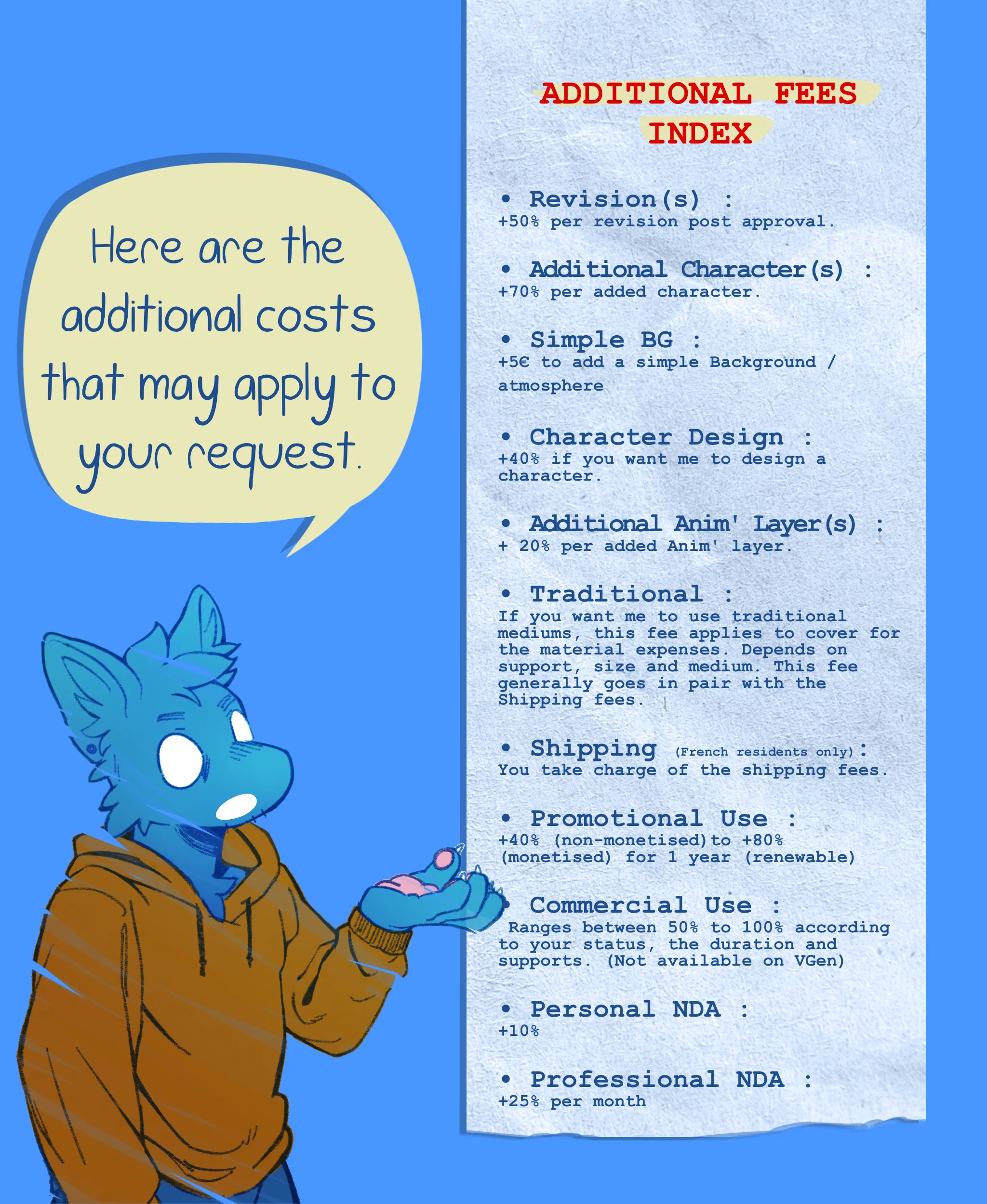 Frais applicables : Révision ; Fond simple ; Character Design ; Usage Promotionnel ; Usage Commercial ; NDA